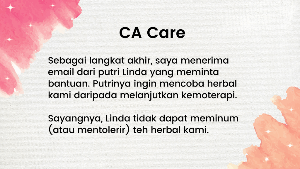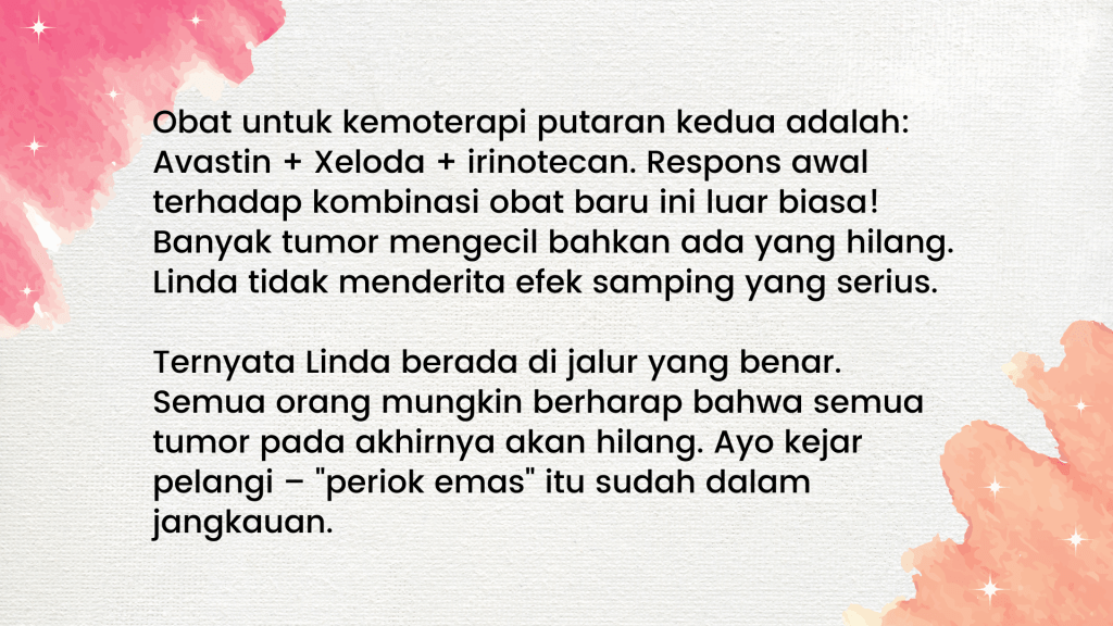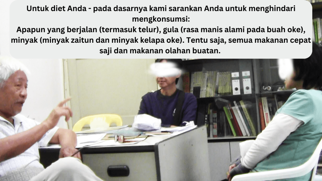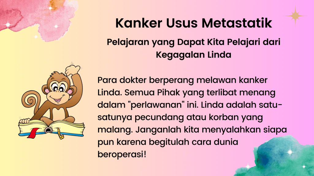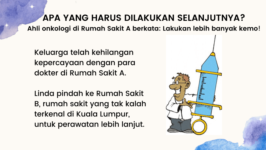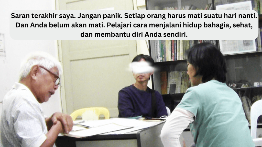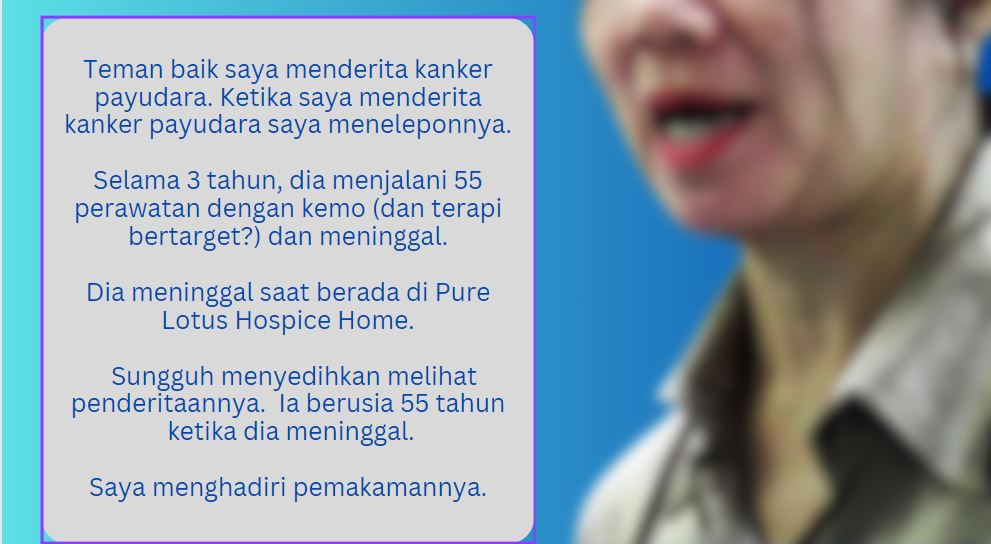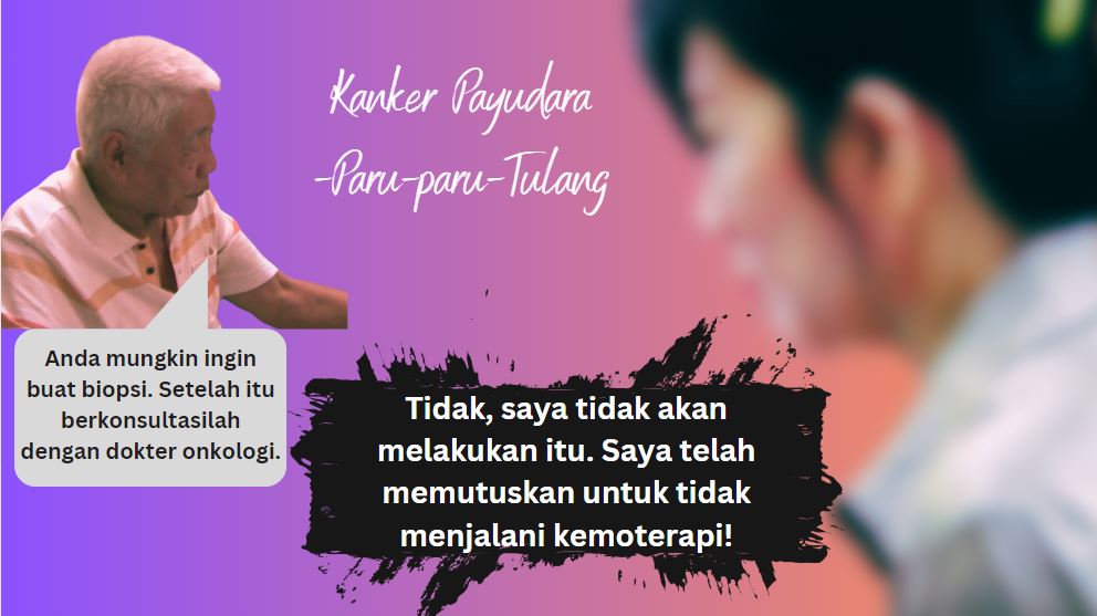 Kenapa dia tidak mau menjalani kemo, radioterapi, dan lain-lain? Sayangnya, dia berasal dari keluarga dengan masalah kanker. Dia pernah bercerita kepada saya bahwa 50% anggota keluarganya menderita kanker. Ayah dan ibunya meninggal karena kanker dan dia melihat penderitaan mereka. Tidak, dia tidak ingin mengalami semua penyiksaan itu.