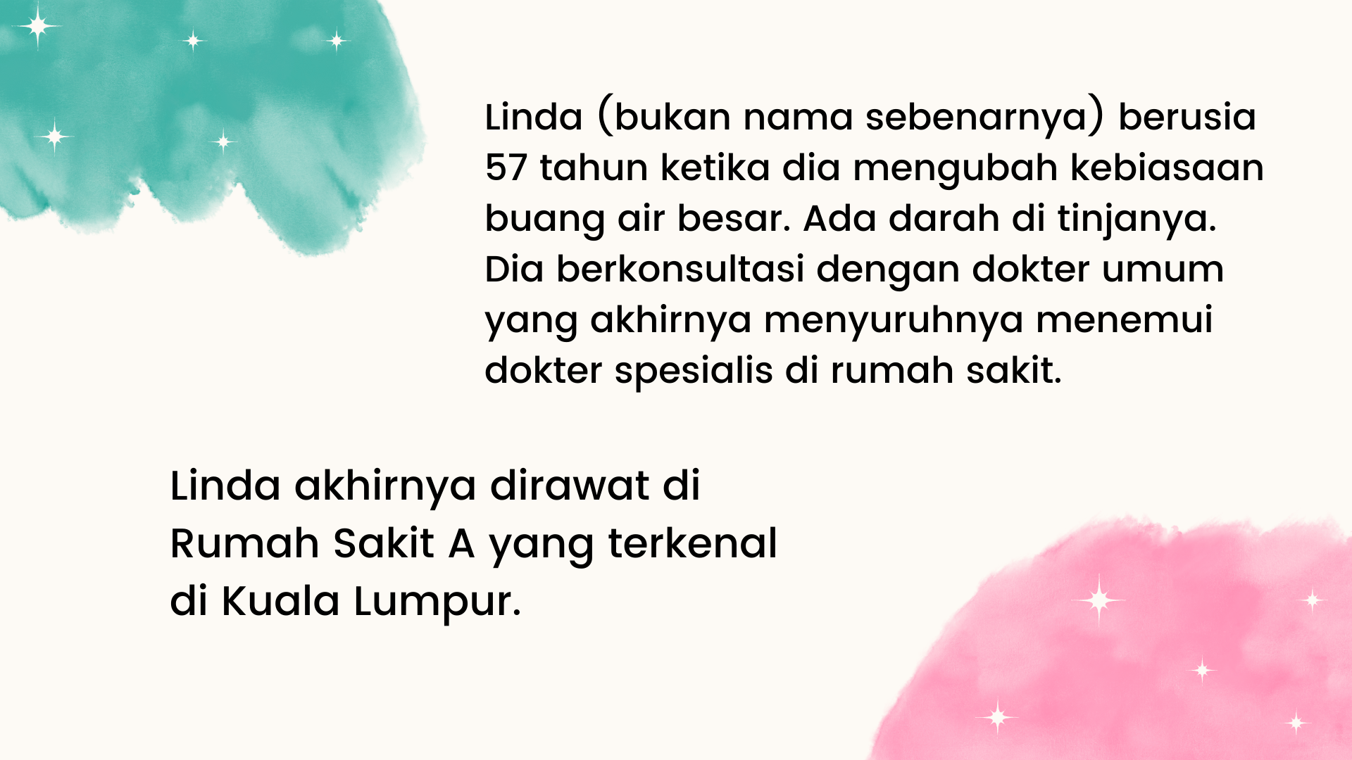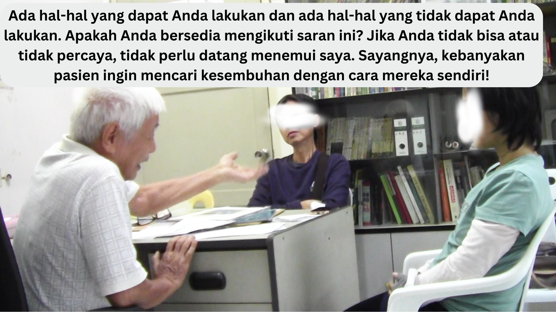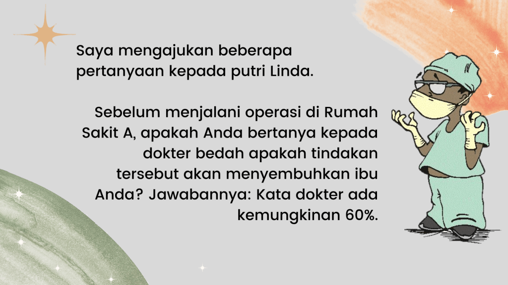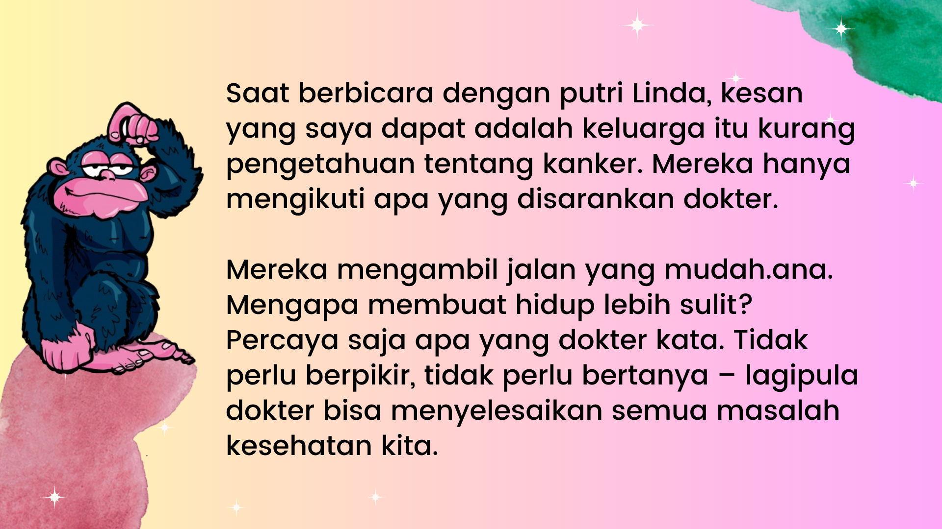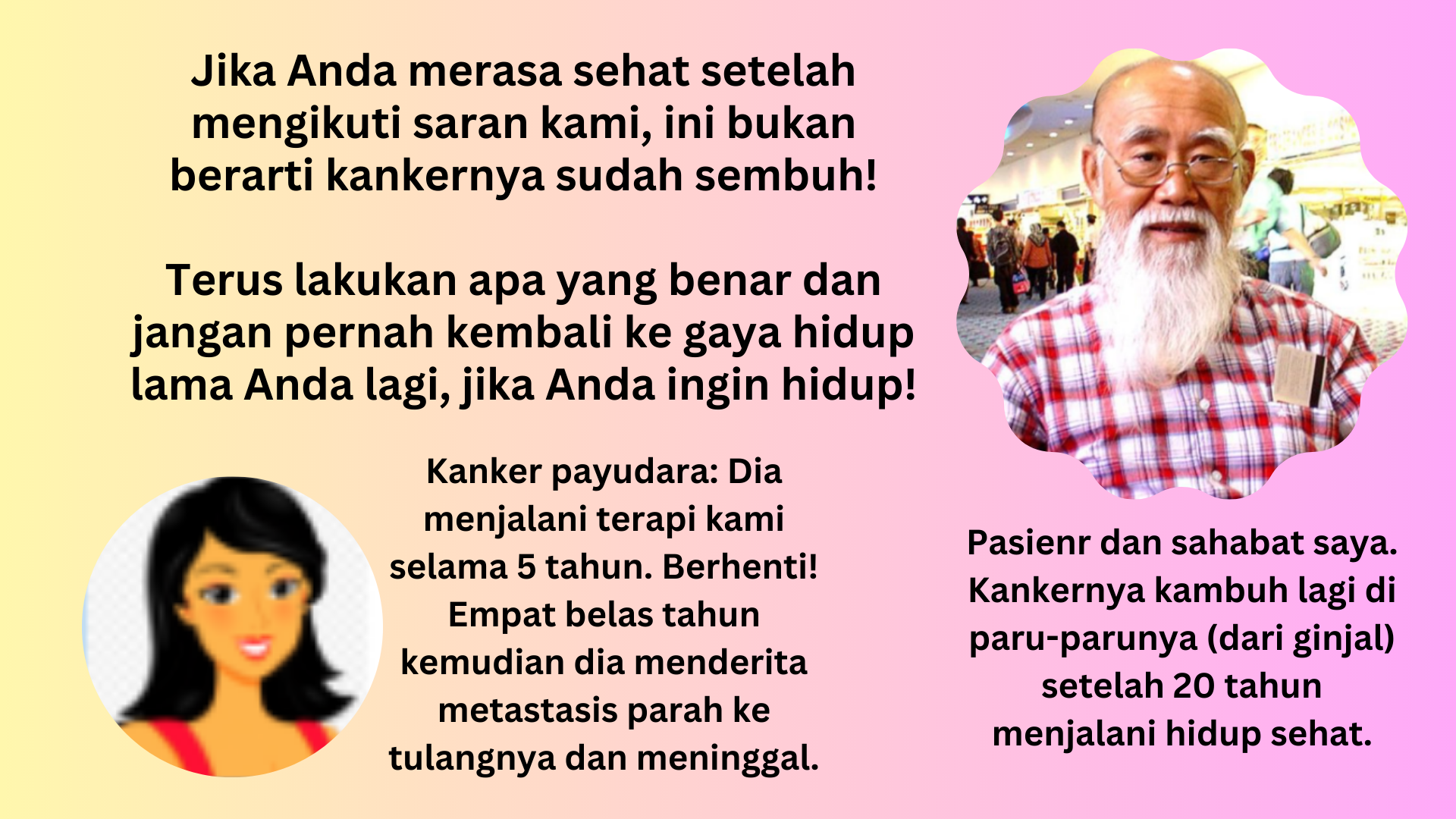 Kenapa dia tidak mau menjalani kemo, radioterapi, dan lain-lain? Sayangnya, dia berasal dari keluarga dengan masalah kanker. Dia pernah bercerita kepada saya bahwa 50% anggota keluarganya menderita kanker. Ayah dan ibunya meninggal karena kanker dan dia melihat penderitaan mereka. Tidak, dia tidak ingin mengalami semua penyiksaan itu.