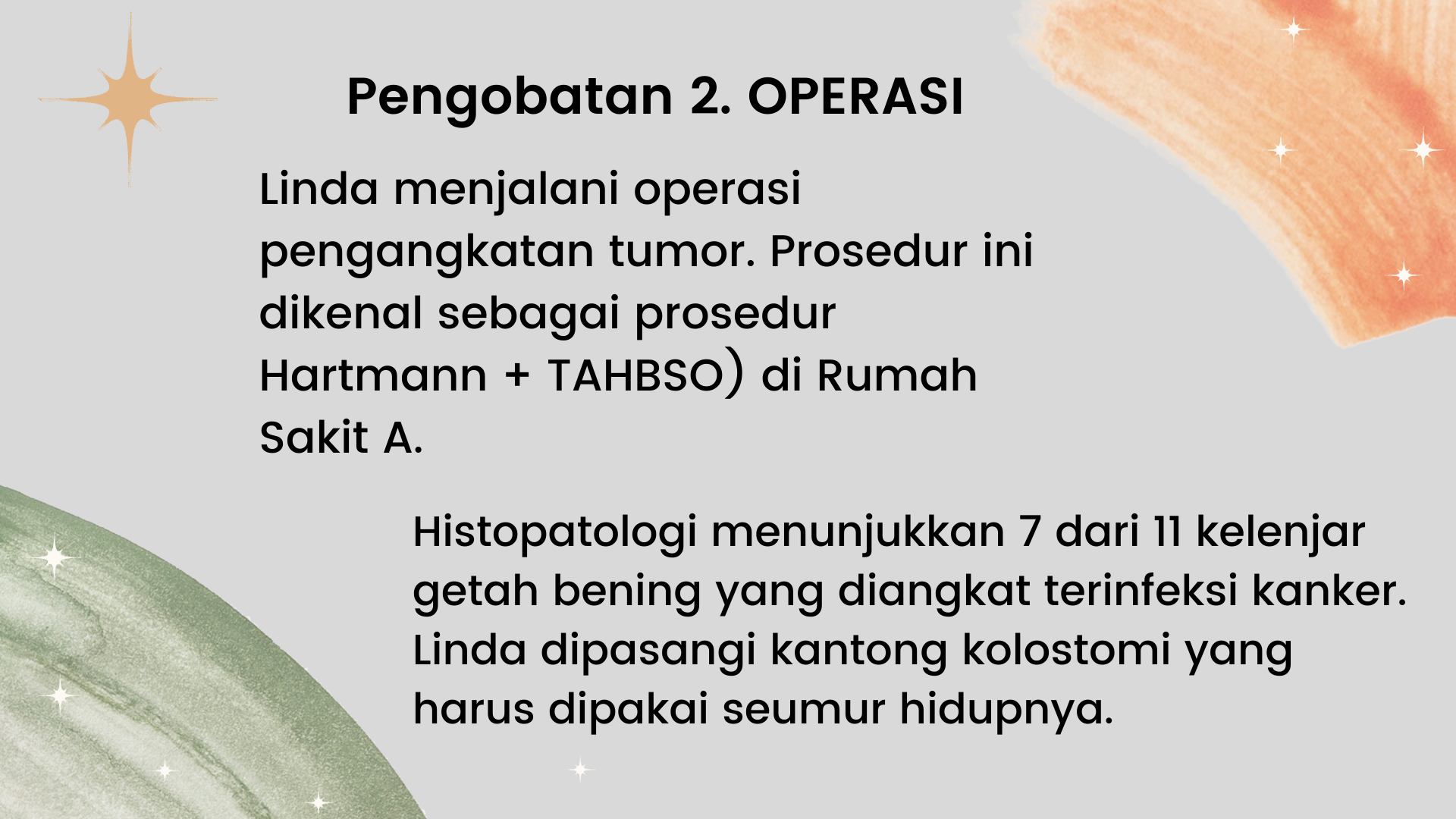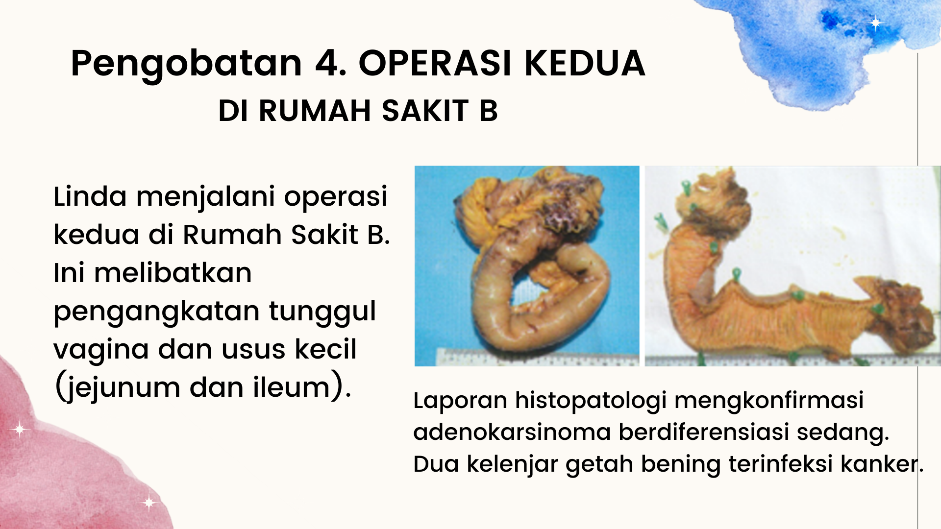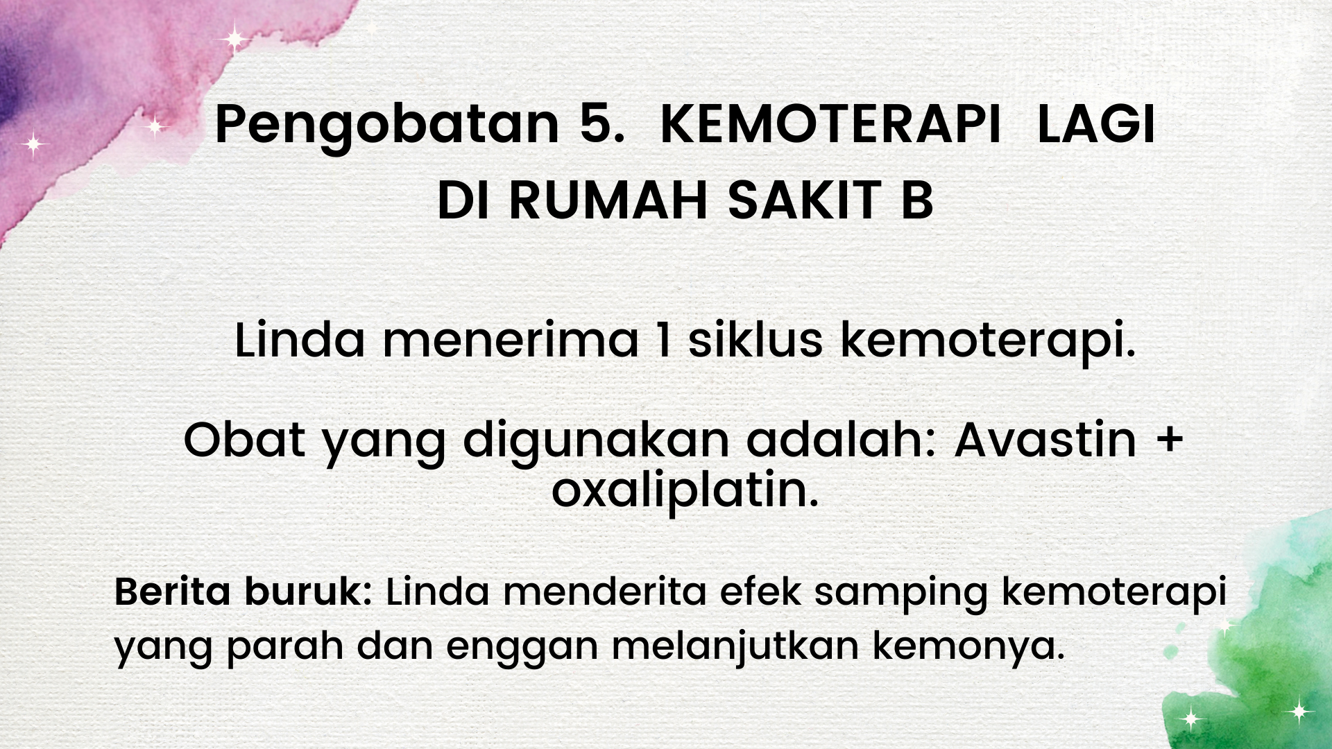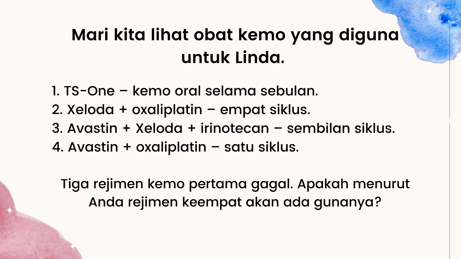 • Enam bulan yang sulit telah berlalu… ibu kembali ke rumah sakit untuk penilaian ulang. Kanker telah menyebar ke daerah pinggulnya dan dokter saran melakukan kemoterapi.