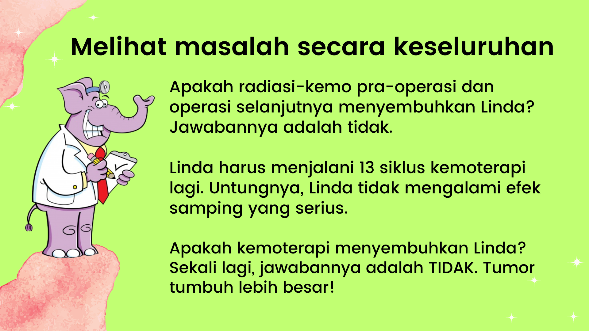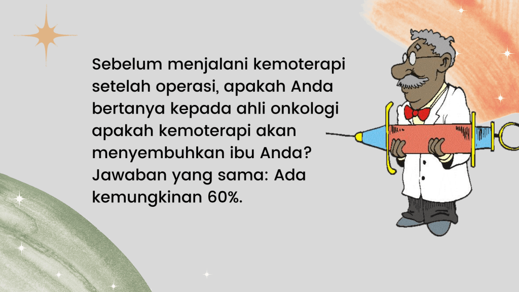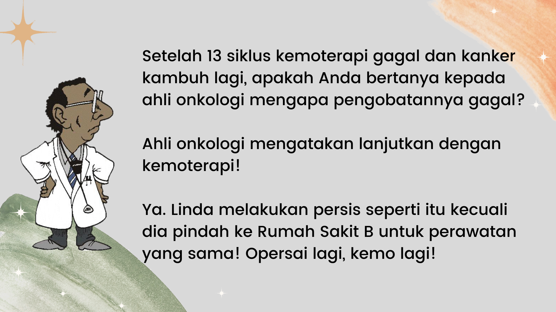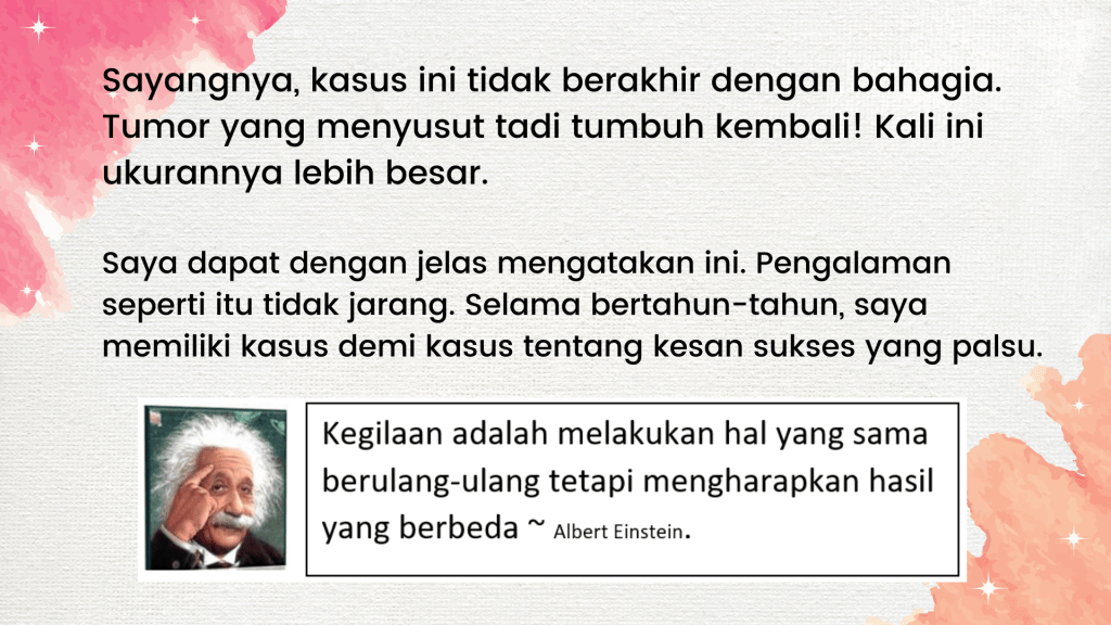• Kita semua pernah melihat setidaknya seseorang dalam hidup kita menjalani operasi, kemoterapi, dan radioterapi, namun ternyata kondisinya jauh lebih buruk dari sebelumnya. Saya melihat hal itu terjadi pada ibu saya ketika saya berusia 12 tahun. Begitu dia menerima kemoterapi, dia seperti tertabrak truk. Alih-alih sembuh, dia malah meninggal beberapa bulan kemudian, dan setiap momen mulai dari kemoterapi hingga kematiannya diiringi dengan penderitaan.