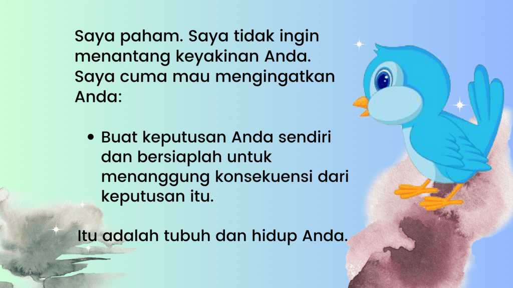 • Agar adil kepada Ina, saya mengatakan kepadanya bahwa saya tidak akan memberikan pendapat saya mengenai hal ini – dia harus mengambil keputusan sendiri. Jika itu satu-satunya jalan yang ia percaya harus diambil, cobalah saja.