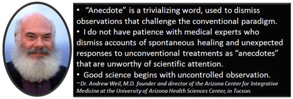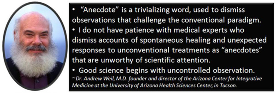 Anekdot adalah kata yang meremehkan, digunakan untuk mengabaikan observasi yang menantang paradigma konvensional. Saya tidak sabar dengan para ahli medis yang mengabaikan laporan penyembuhan spontan dan tanggapan tak terduga terhadap pengobatan tidak konvensional sebagai “anekdot” yang tidak layak mendapat perhatian ilmiah.