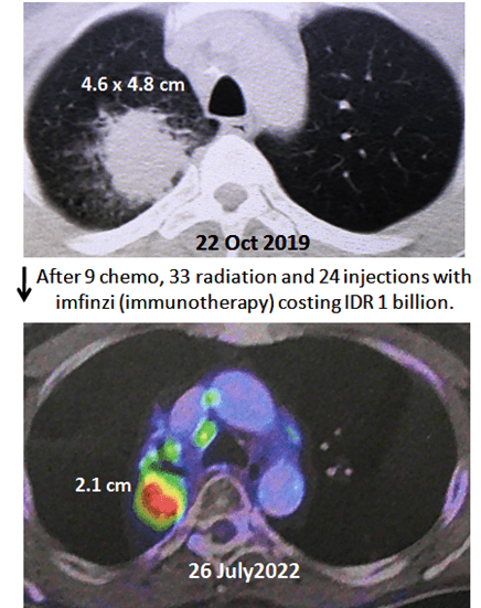 Pemindaian PET pada 26 Juli 2022 menunjukkan lesi aktif metabolik berukuran 2,1 cm terlihat di lobus paru kanan (lihat gambar di atas). Ini menunjukkan tumornya tidak kunjung sembuh! Aman diminta melakukan biopsi lagi untuk memastikan kembali bahwa massa ini masih merupakan kanker! Namun, ahli onkologi tersebut mengatakan kepada Aman bahwa TIDAK akan ada lagi kemoterapi atau imunoterapi untuknya. Satu-satunya pilihan yang tersisa adalah operasi.