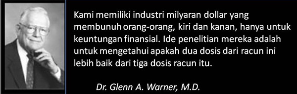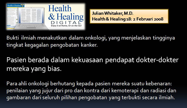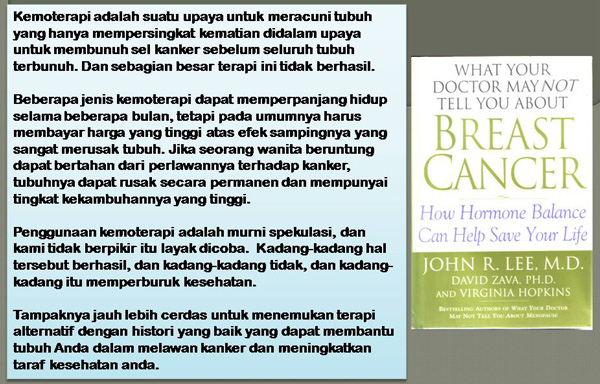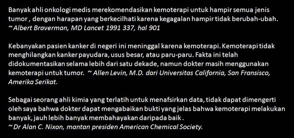 “Untuk mengetahui sebagian atau seluruh kebenaran dari persetujuan medis di atas, apa yang perlu Anda lakukan adalah hanya mencari “efek samping kemoterapi” di internet. Anda akan mendapatkan beberapa masukan yang menarik. Hanya untuk rasa ingin tahu saya mencari ini – “kematian akibat kemoterapi”. Cukup menarik tidak ada jawaban yang eksplisit untuk pertanyaan ini baik dari pihak medis atau perusahaan obat. Tidak ada yang berbicara tentang itu! Tapi tanyakan pada anggota keluarga pasien kanker dan banyak dari mereka dapat memberitahu Anda bahwa kemoterapi membunuh! Klik link ini dan dengarkan sendiri apa pasien dan keluarga mereka katakan tentang kemoterapi: https://cancercareindonesia.com/category/kemoterapi-radioterapi/