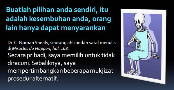 Mari kita mencoba untuk melihat realitas. Apakah ada bukti “medis atau ilmiah” bahwa kemoterapi dapat menyembuhkan kanker stadium 4? Pasien tersebut telah menghabiskan RM 36.000 untuk tahap pertama kemo. Apa yang dia dapatkan? Kanker di tulang-tulangnya! Mengapa kanker menyebar begitu luas di tubuhnya?