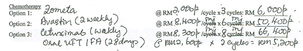 Dokter mengatakan kepada pasien dan keluarganya bahwa kemoterapi harus ditinggalkan karena obat-nya tidak cocok untuknya. LCC diminta untuk mengambil obat-kemo oral sebagai gantinya. Total biaya perawatan ini sebesar RM 83.000.