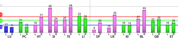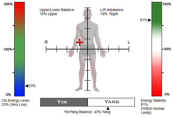 Para Agugraph di-atas menunjukkan energi qi yang rendah – total 23%. Qi Paru-Nya rendah, sementara Qi Jantung, Usus Kecil, Energizer Triple, Limpa, Hati, Kandung kemih terbagi. Mereka yang telah menjalani perawatan medis invasif menderita masalah tersebut. Keseimbangan yin-yang itu miring ke arah Yang – 43%.