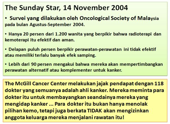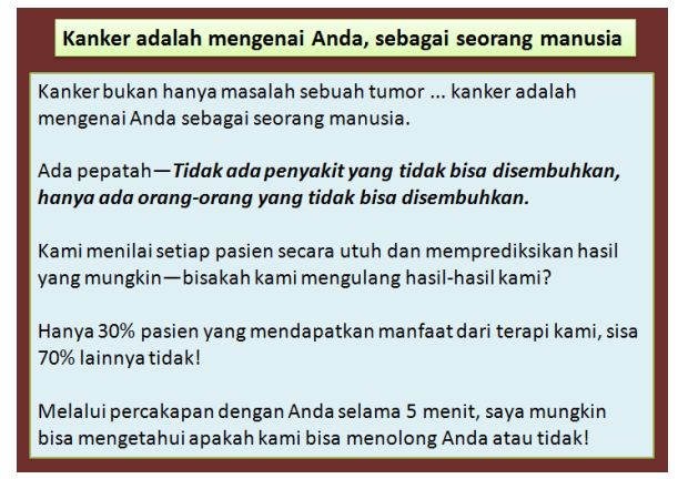 b) Jadi, jika Anda datang ke sini mengharapkan saya menyembuhkan Anda, ketahuilah bahwa saya juga tidak bisa menyembuhkan kanker Anda. Dari pengalaman saya, tidak seorang pun di bumi yang bisa menyembuhkan kanker –kanker akan kambuh kembali.