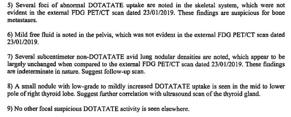 Pada 12 Februari 2019, ia melakukan pemindaian gallium dotatate PET (prosedur pemindaian khusus untuk kanker neuroendokrin).