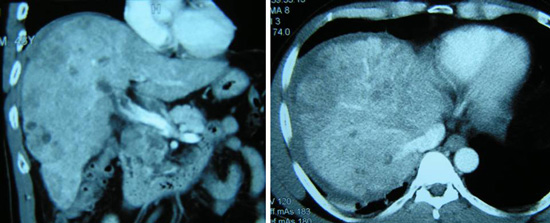 CT scan dibagian perut menunjukkan ada beberapa massa berukuran 7,3 x 5,1 cm ; 6,3 x 6,1 cm dan 7,3 x 4,5 cm, pada lobus kanan hati nya, dan diduga kanker hati yang telah menyebar atau metastasis kanker hati. Biopsi dilakukan pada tanggal 23 Desember 2010 dan dikonfirmasi sebagai kanker liver dengan sifat moderately differentiated.