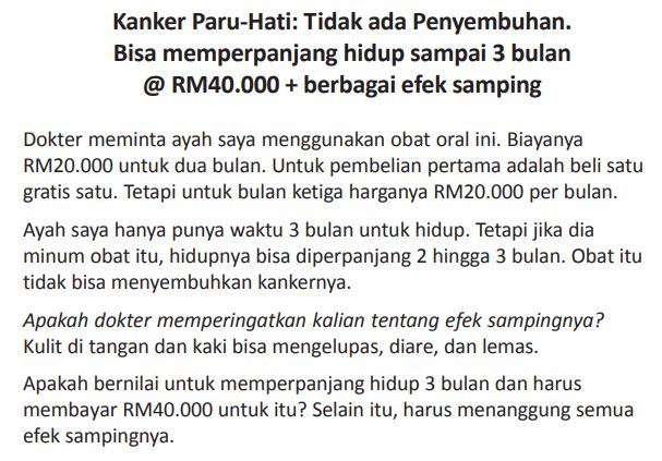 2. Kelihatannya yang dapat ditawarkan sebagai obat modern itu adalah Nexavar. Maukah anda sebagai dokter ahli menawaran obat ini kepada pasien, walaupun tahu bahwa biayanya sekitar RM 20.000 per bulan dan obat tersebut tidak akan menyembuhkan ? Saya kira anda akan mau jika pasiennya cukup kaya untuk membayarnya atau jika asuransinya mencakup biayanya.