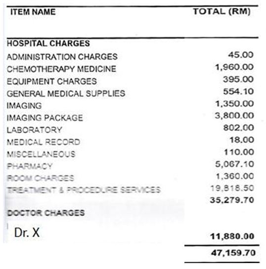 Seorang pasien kanker prostat dirawat selama 8,5 hari di rumah sakit swasta di Kuala Lumpur. Total tagihan rumah sakit mencapai RM47.159. Bayangkan saja seperti apakah tagihannya jika masa rawatan itu diperpanjangkan menjadi satu bulan atau lebih? RM200K?