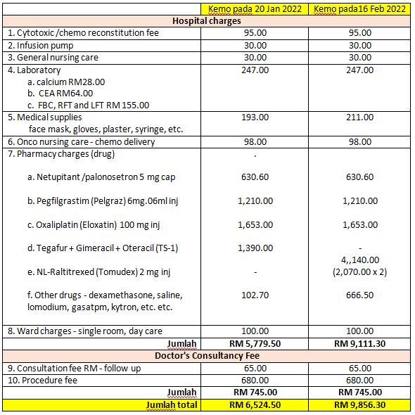 • Total biaya kemoterapi bervariasi antara INR 138.974 dan INR 208.462. Ini adalah RM 7.954 dan RM11.931.