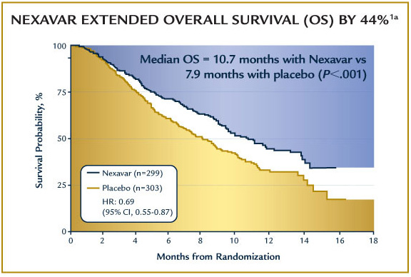 • Dengan pemberian Nexavar pasien dapat hidup lebih lama  2,8 bulan. Catat bahwa mereka tidaklah sembuh sama sekali. Akhirnya pasien meninggal. Kelangsungan hidup rata-rata berkisar dari sekitar 8 sampai 11 bulan, terlepas dari apakah mereka menggunakan Nexavar atau tidak.