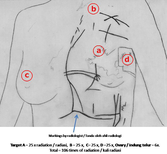 Pastikah Anda? Apakah itu betul? Le: Tentu, benar. Saya diberi 25 rawatan radiasi pada payudara kiri saya (a). Selepas itu 25 kali di bawah tulang selangka saya (b). Benjolan lain muncul di payudara kanan saya dan saya lagi diberi 25 rawatan radiasi di payudara kanan saya (c). Kemudian indung telur saya diradiasi – jumlah enam kali. Kanker menyebar sekali lagi ke payudara kiri saya dan saya lagi diberi 25 kali radiasi (d). Sebenarnya saya baru saja menyelesaikan radiasi yang ke-106 beberapa hari yang lalu. dan saya datang ke sini.